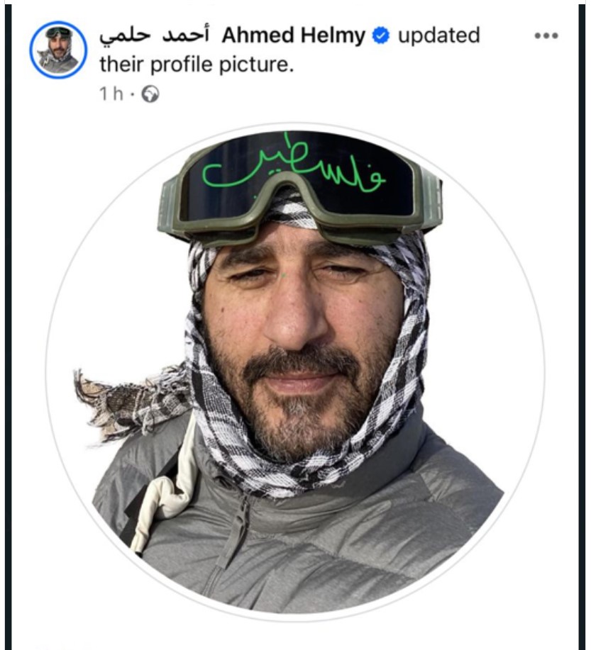 حيث قام حلمي بتغيير صورة حسابه بزي فلسطيني ونظارة مكتوب عليها كلمة فلسطين، مما حاز على إعجاب متابعيه بتفاعلهم مع الصورة.
